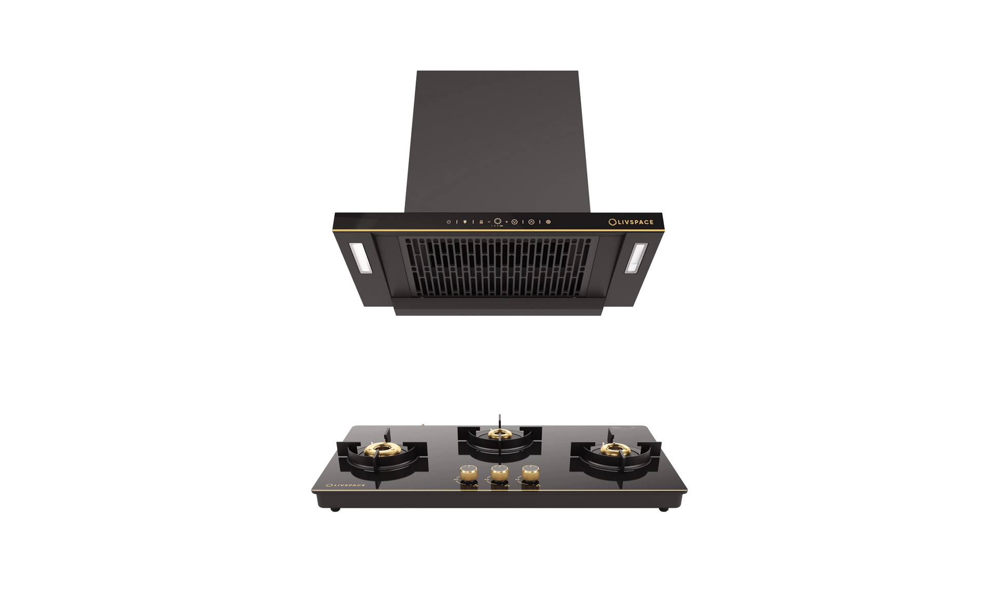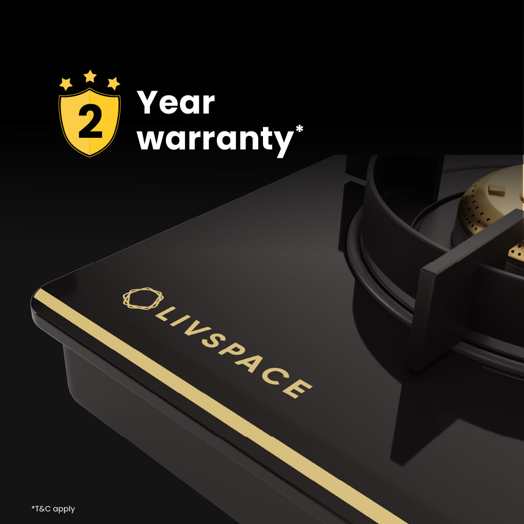 Intellia by LIVSPACE T-shape shape BLDC autoclean Filterless 600mm 1600m3/h suction Chimney & 3 Brass Burner Gloss finish 770mm with Auto Ignition Cooktop with installation (Ducted) | Intellia CH T 60 & Intellia CT 77 3B